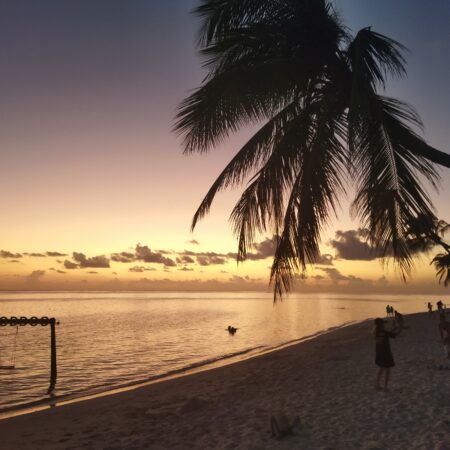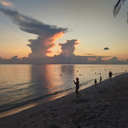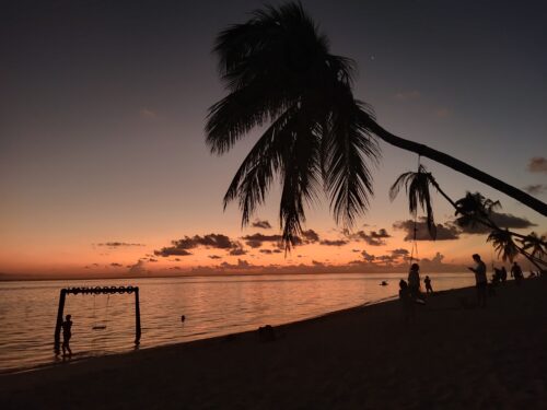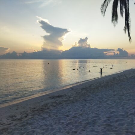After lunch — straight to the beach. Sunset Beach is about a 10-minute walk from the guesthouse, along paths through lush greenery toward the turquoise glow. Words can’t describe that jubilant, crystal-clear blue — like a liquid gemstone. You step onto the shore and feel like you’ve entered paradise. Palm trees with swings, white coral sand, and warm gentle sea… Air +30°C, water +28°C. In a word — perfect!