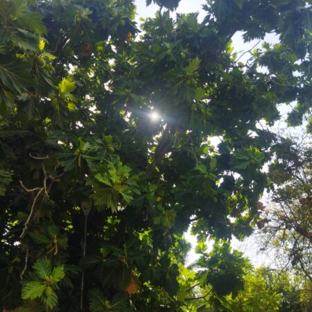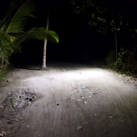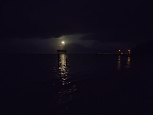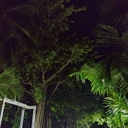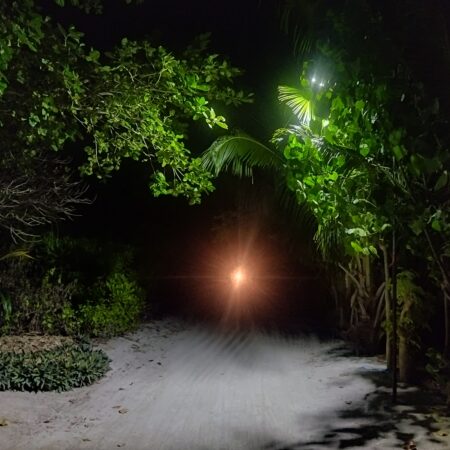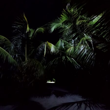Then I went for another swim, through the night forest. Very dark and eerie. But the sea was bathed in midnight light — you don’t want to leave it.) I switched on my phone flashlight as a beacon on the shore so I’d know where to find my clothes. And the trail out. It lit up a cozy little corner of jungle. 🙂
