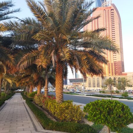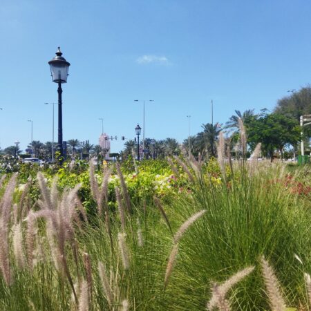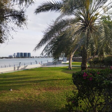 Cold!! Can you believe it? In Abu Dhabi, in April. Never expected that. Windy, brr. West Bay beach, the Corniche promenade — empty. Yellow and red flags flapping in the wind. I was the only one swimming, no one else around. It’s very shallow there, barely waist-deep. But the beach is public, clean, sandy, well maintained. And overall the promenade is beautiful, full of greenery. Abu Dhabi seems to be one of the greenest cities in the desert. Hard to imagine how much water it takes to keep everything alive.