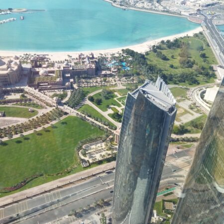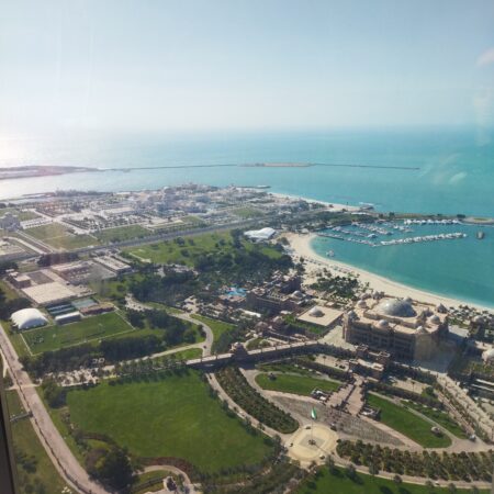 I went up to Observation Deck at 300, located in the Etihad Towers — that cluster of skyscrapers by the coast — for only 35 AED (looks like prices have gone way up since). An impressive 360° view of the city and the sea from the 74th floor! Gorgeous. The viewing deck at Burj Khalifa is about 50 floors higher, but even so, the panorama here is stunning — the Corniche beach, the Arabian Gulf, and the Emirates Palace hotel all spread out below.