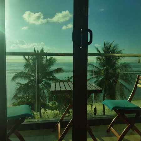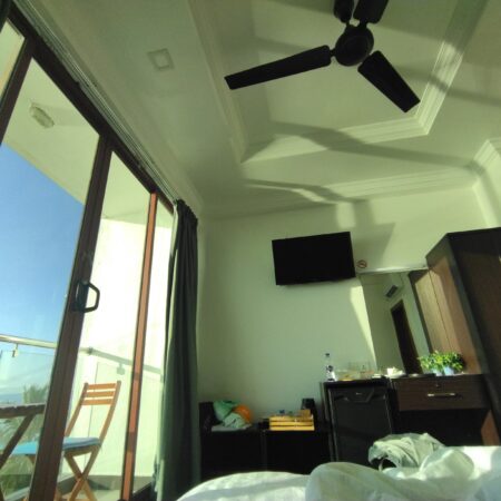 The room was big, almost too spacious for one person. A balcony overlooking a picturesque inner courtyard. And a coconut palm right outside the window.)