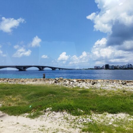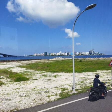 But I did find the local bus. Had to wander around in the heat for half an hour, asking random people and trying my luck, but eventually I got to Hulhumalé for 10 MVR instead of 10 dollars for a taxi. Savings again. Route R4. The buses are super comfortable, you pay with a Visa card — just like in Antalya. Very convenient!