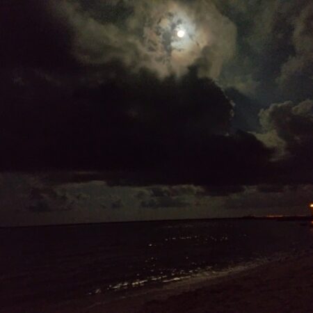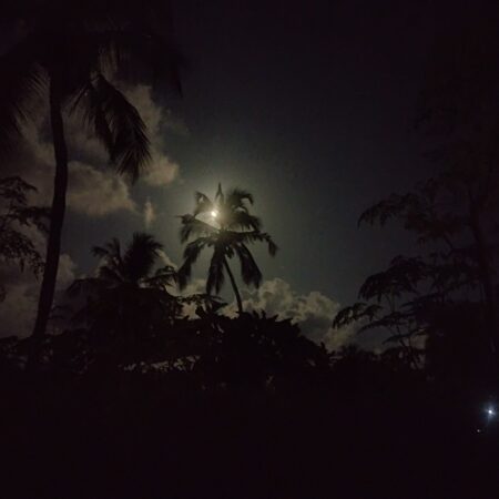 I swam in the night sea. It was so bright — silver clouds, and the full moon right at the zenith, glowing in a rainbow halo. Stars sparkling like diamonds. White, soft sand. Palms along the shore, even chairs to sit on while listening to the surf behind the breakwater. And the water was warm like fresh milk. Pure bliss.