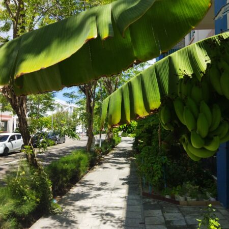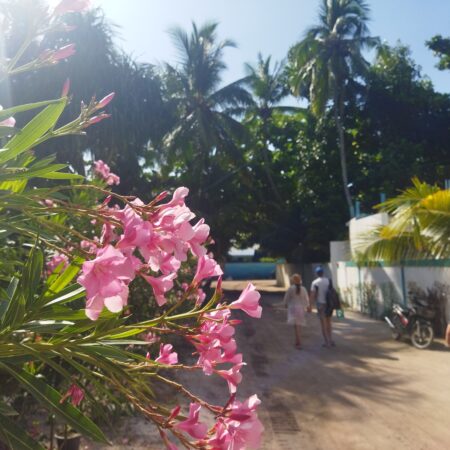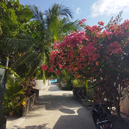 Everywhere in the village there are flowers, wide-branched palms, fruit trees. Noni, maybe guava. Little long-legged lizards (tiny iguanas or geckos) run along the walls. Beyond the village lie jungle, coconut plantations, and vegetable fields. They even grow cucumbers here. Thoddoo is one of the few islands with its own agricultural production.