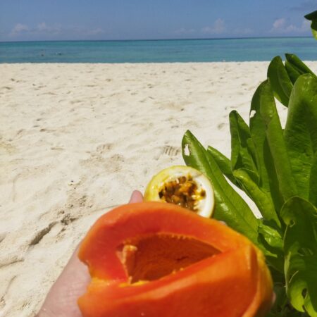 Went swimming at the first beach. Guaranteed delight and bliss. Bought a papaya and two passion fruits for 45 rufiyaa ($3). The papaya was big and only 10 rufiyaa because they grow it here. Sweet as a melon. Passion fruit — tart inside, with that tropical punch! Really loved it.)