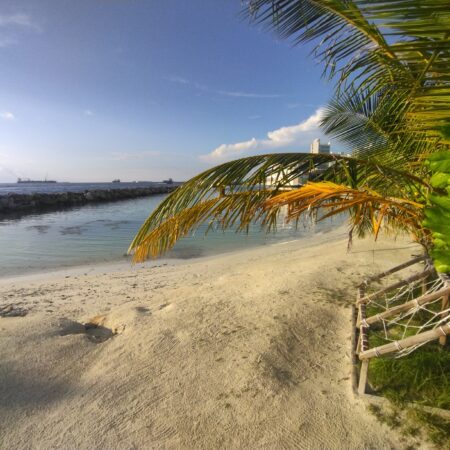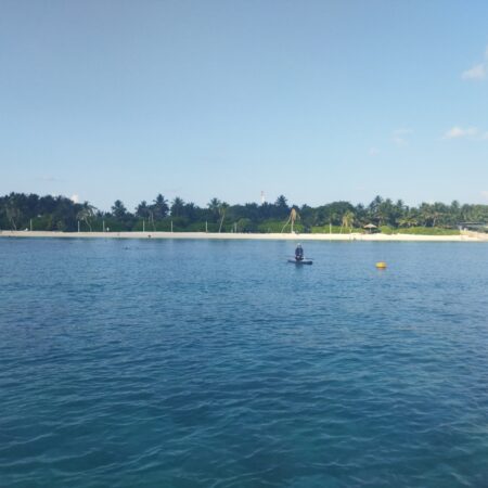 You can wade over to a big inflatable pool on the water. There the bottom is clean and deep enough — a great place to swim while waiting for a flight home or a transfer to a resort. Hulhumalé is exactly that: like a transit hub near the airport, connected to the capital Malé by a bridge. Guests don’t stay long here.