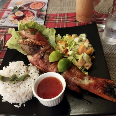 And in the evening, at the restaurant across from the guesthouse, I got to try my very own catch — they cooked it specially for me for $10. With veggies, lemons. Delicious!