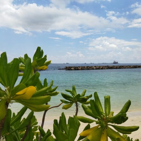 There are artificial beaches on two opposite ends of the island. Small, tidy-looking, but a bit dirty — bits of debris floating in the water sometimes.