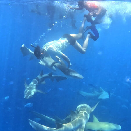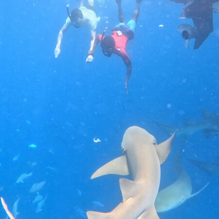 We sailed far along the edge of the atoll, almost to Rasdhoo and Ukulhas. We were looking for the famous mantas but didn’t find them. Instead, we swam with sharks! There were about a dozen. Nurse sharks. I even touched one! Felt like a mushroom. 🙂