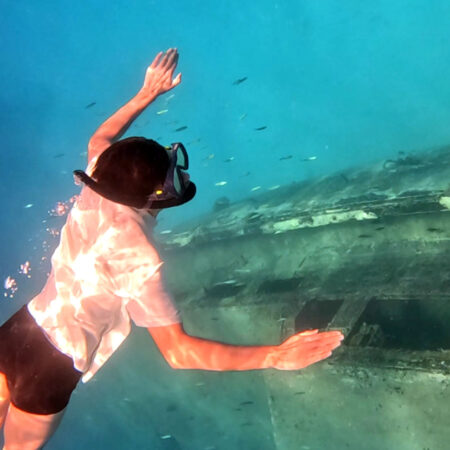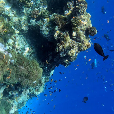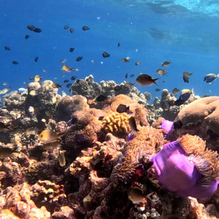 So many fish! All sizes and colors — your eyes can’t keep up. About 50 meters from shore lie the reefs, clearly visible through the glassy water.